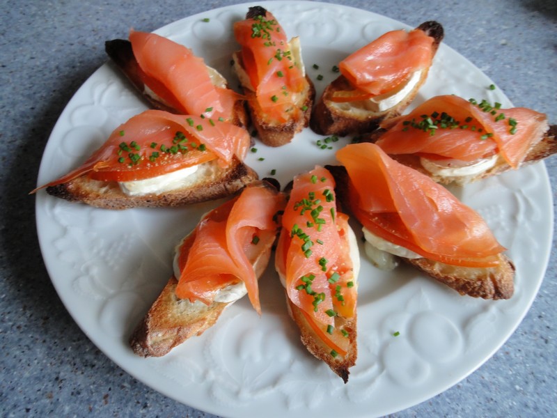 Aujourd’hui, j’ai eu l’idée de faire un amuse-bouche avec une fine tranche de pain, une fine tranche de tomate et une rondelle de chèvre puis de faire dorer au four, et finir avec du saumon fumé. Je trouve cette recette vraiment excellente et en plus facile à réaliser.