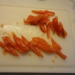 Ensuite, laver une tomate, puis retirer le pédoncule à l’aide d’un couteau (le pédoncule est la partie ronde qui relie le fruit à la plante). Puis couper la tomate en quatre comme sur les photos et retirer le cœur, puis couper le restant en lanière en biais, puis les poser sur chaque assiette et décorer avec un brin de ciboulette couper en deux puis servir.