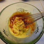 Une fois que la mayonnaise est montée, ajouter 3 cuillères à soupe de ketchup, quelques gouttes de Tabasco et mélanger le tout puis mettre de côté.