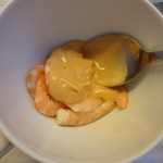 Décortiquer 32 crevettes, puis les mettre dans un petit saladier, ajouter 4 cuillères à soupe de sauce cocktail et mélanger le tout.