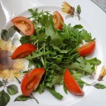 Pendant ce temps, laver les 2 tomates puis retirer le pédoncule à l’aide d’un couteau (le pédoncule est la partie ronde qui relie le fruit à la plante). Puis couper les tomates en quartiers et les disposer dans les assiettes avec un peu de salade au milieu.