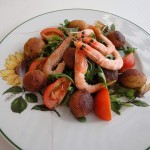 Salade de roquette, acras de morue et crevettes