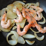 Commencer par décortiquer les crevettes en prenant soin de ne pas retirer la tête, puis les mettre de côté. Éplucher les deux oignons, et les couper en deux puis en petits quartiers. Mettre la poêle à chauffer sur feu vif avec 2 cl d’huile d’olive, puis y faire colorer les oignons. Quand les oignons commencent à être un peu colorés, mettre sur feu moyen et prolonger la cuisson pendant encore 5 minutes en remuant de temps en temps. Puis ajouter les crevettes, 1 pincée de piment d’Espelette et 10 cl de fumet de poisson et laisser cuire jusqu’à réduction complète du fumet et en mélangeant de temps en temps.