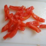 Ensuite, laver les deux tomates, retirer le pédoncule (le pédoncule est la partie ronde qui relie le fruit à la plante). Puis couper les tomates en quatre quartiers chacune, puis retirer le cœur, et couper en grosses lanières le restant des tomates et les mettre de côté.