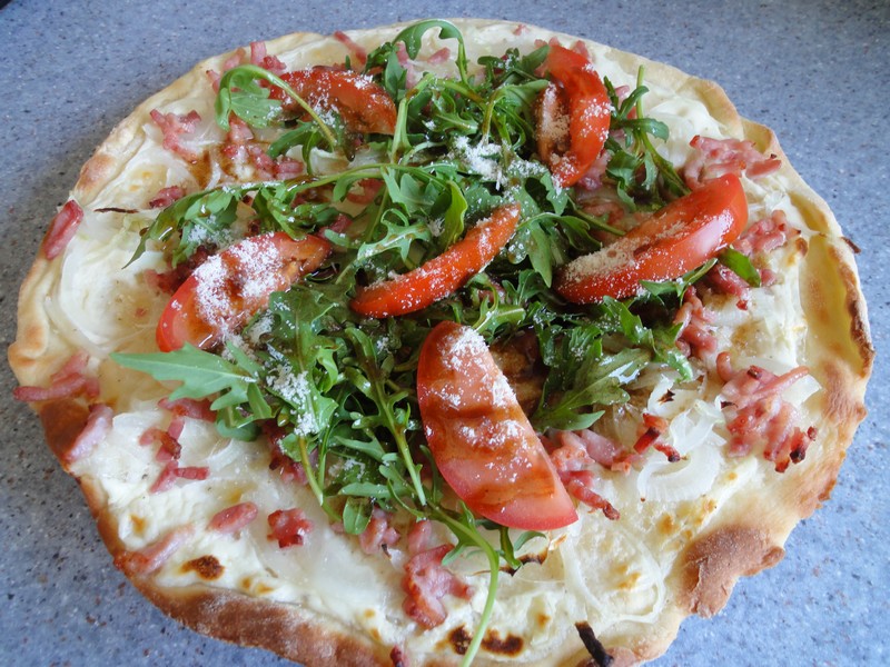 Aujourd’hui, je vous propose la recette de la Flammekueche, mais je l’ai un peu modifié en ajoutant un peu de roquette, de tomate de parmesan et une vinaigrette au balsamique. Flammekueche en Alsacien veut dire tarte flamber, ce nom peut porter à confusion, car elle n’est pas flambée à l’alcool, mais par les flammes d’un four à bois.